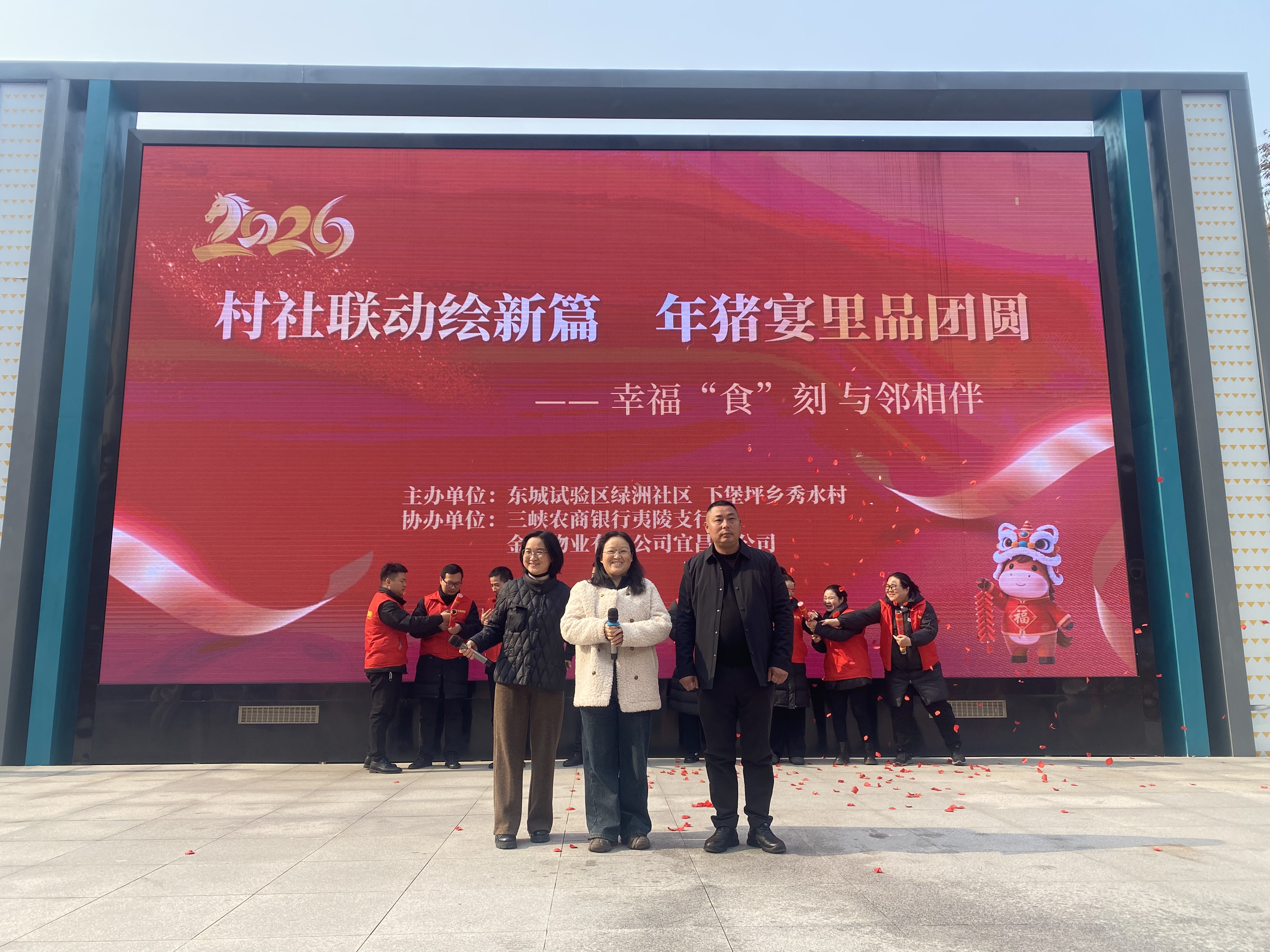 年味渐浓暖意融,村社同心庆团圆。1月17日,绿洲社区文化活动广场张灯结彩、喜气洋洋,一场以“村社联动绘新篇 年猪宴里品团圆”为主题的特色活动在此热闹上演。本次活动由绿洲社区牵头,联合下堡坪乡秀水村、三峡农商行夷陵支行、金碧物业宜昌分公司共同举办,将百姓大舞台的文化盛宴、村社共建的签约仪式、贴近民生的政策宣传与助农惠民的农产品展销融为一体,让社区居民在家门口邂逅乡村年味,让秀水村的优质农产品走进城市烟火,在欢声笑语中奏响城乡融合发展的和谐乐章。