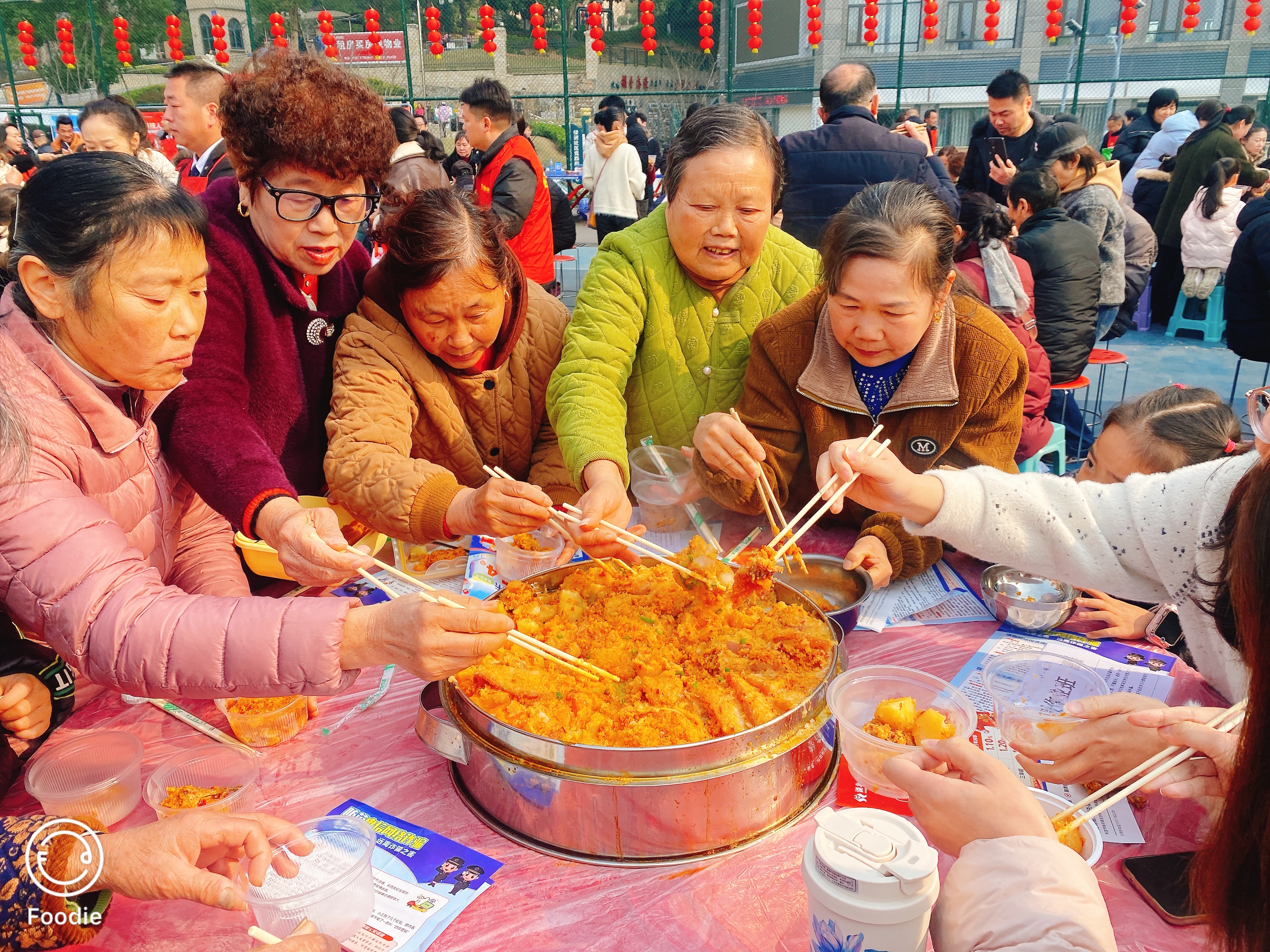 而整场活动的“压轴大戏”,当数那席承载着团圆寓意的年猪宴抬格子。秀水村村民喂养的新鲜粮食猪猪肉与高山的萝卜、土豆、南瓜等食材分层铺入蒸笼,再撒上姜末、蒜末与自家腌制的腊肉丁,淋上秘制酱料,架在大灶上慢蒸。随着蒸笼盖子缓缓掀开,腾腾热气裹挟着肉香、菜香扑面而来,瞬间弥漫整个广场。“抬格子咯!”16名工作人员抬起沉甸甸的蒸笼,依次登场,格子中肥瘦相间的猪肉色泽诱人,配菜吸饱了肉汁,软糯鲜香。没有烦琐的礼节,只有真诚的笑脸,大家拿起碗筷,你一言我一语地分享着生活趣事,品尝着地道的乡村美味。“这抬格子太香了,是小时候过年的味道!”社区居民杨叔叔夹起一块蒸肉,不住地称赞。热气腾腾的蒸笼旁,大人举杯畅谈,孩子追逐嬉戏,邻里间不分彼此,在鲜香的滋味中拉近了距离,让团圆的暖意愈发浓厚。