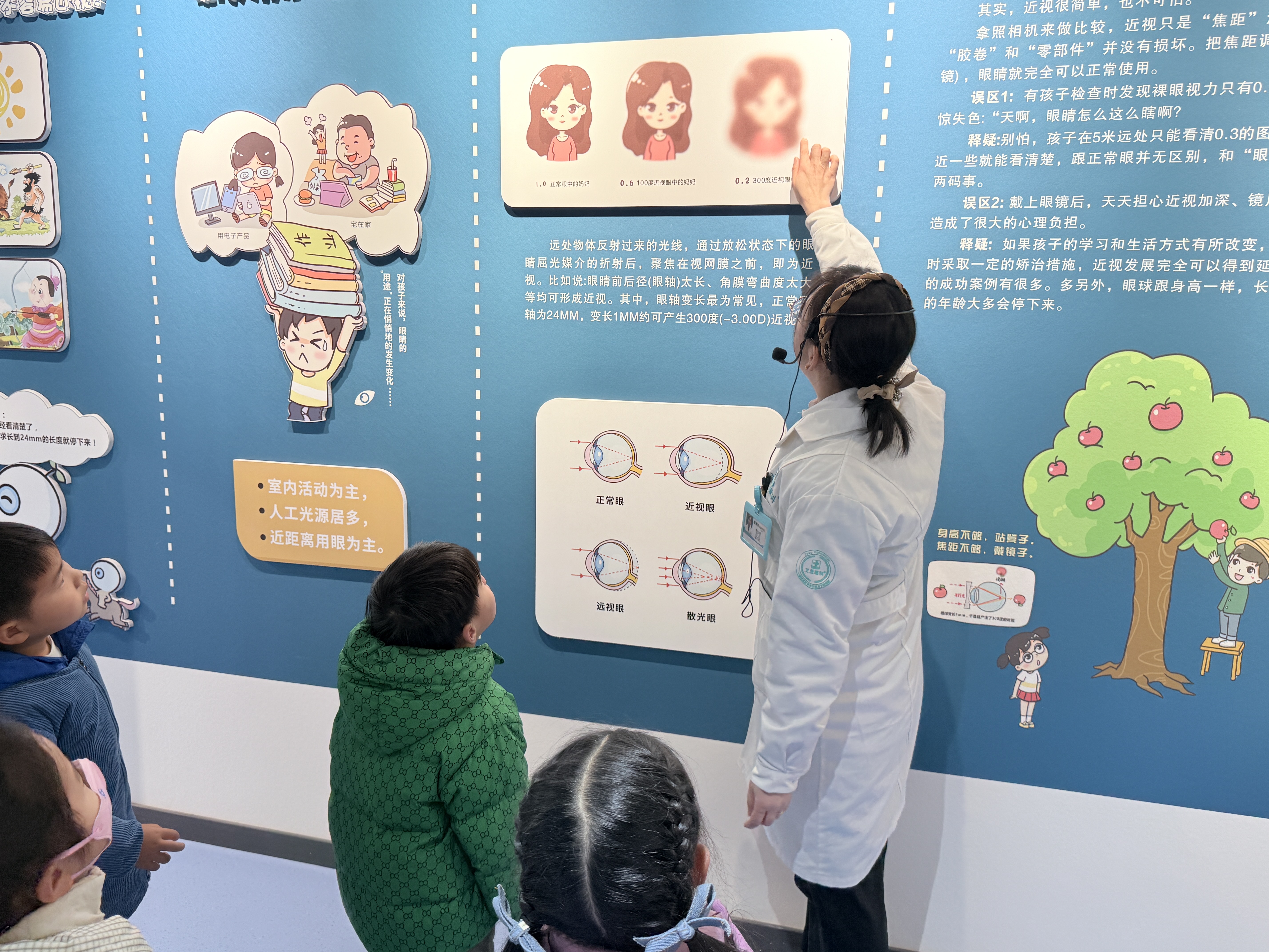 活动中,孩子们扮演小医生,互相测试视力,在医护指导下学习简单视力检查方法,直观感受眼视光科学的魅力。科普馆内,亲子家庭参与实验小游戏、5D光影互动、盲道体验等趣味项目,在镜子迷宫挑战、3D打卡定格中,轻松掌握护眼知识,体会清晰视界的珍贵。互动答疑环节,眼科医师针对近视预防、日常用眼等家长关切问题,详解爱眼护眼实用技巧,还为儿童提供基础视力筛查,建立初步视力档案并给出个性化建议。