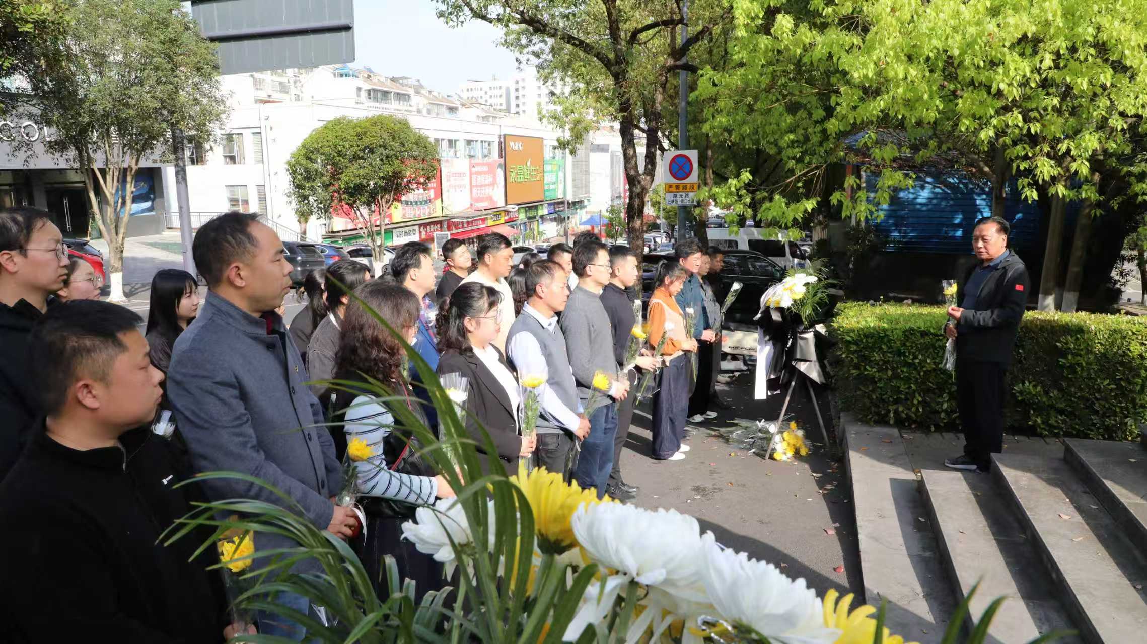 干部代表李云高烈士塑像敬献花篮,全体人员深深鞠躬,随后肃立默哀,表达对李云高烈士的无限敬仰与深切缅怀。仪式最后,全体人员手持鲜花,依次缓步绕行烈士塑像,将鲜花摆放在塑像前,寄托着无尽的哀思和敬意。