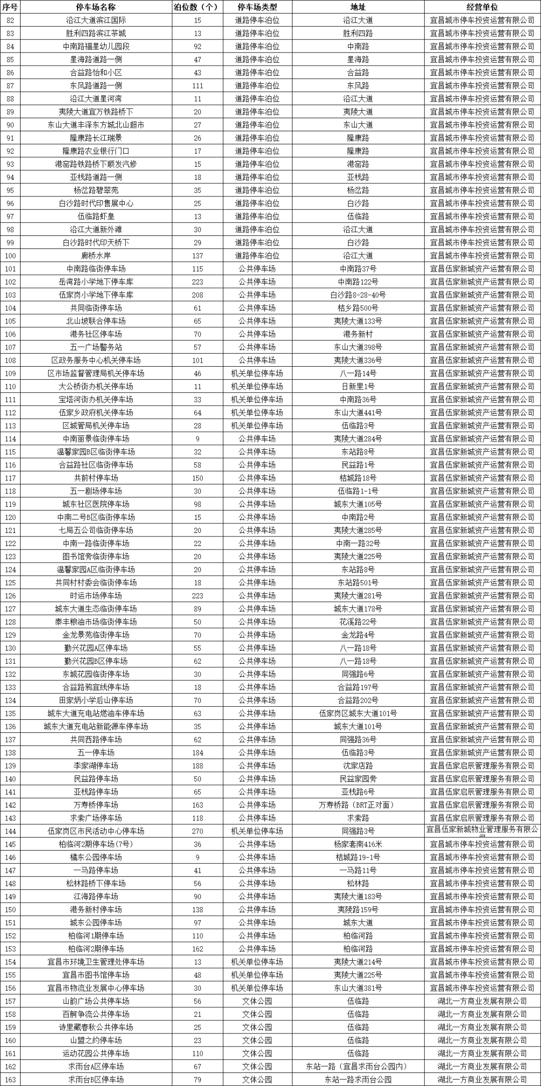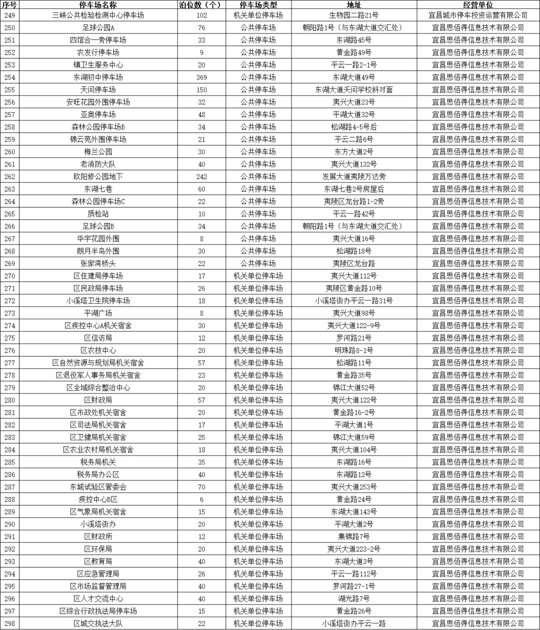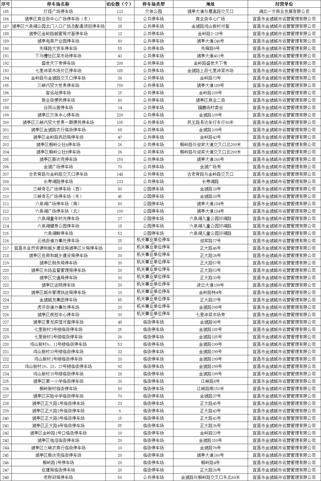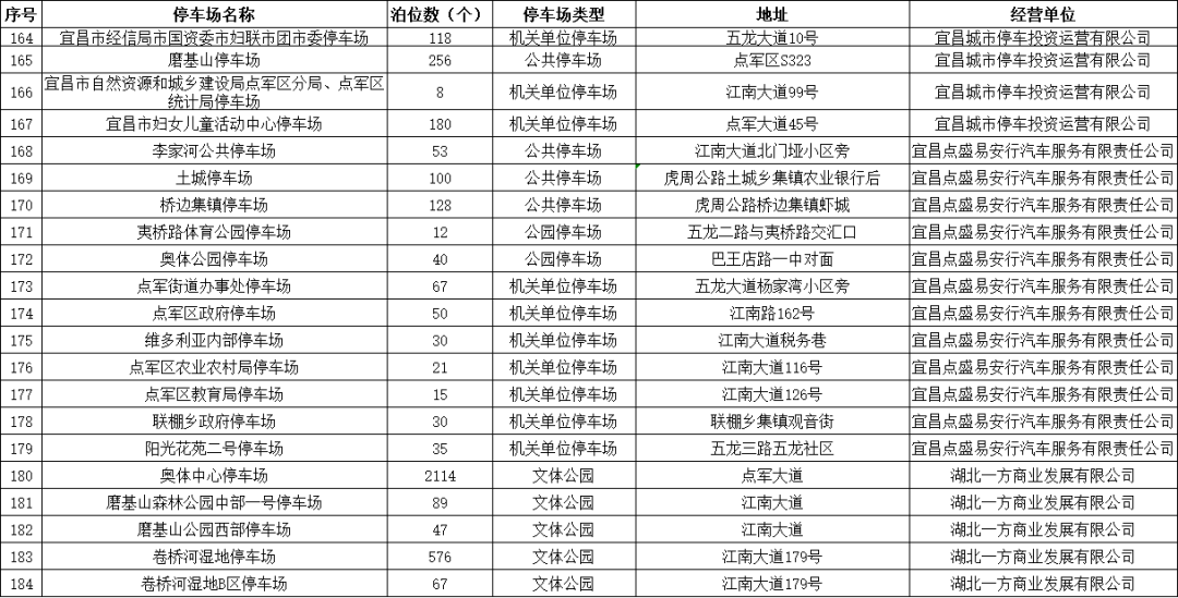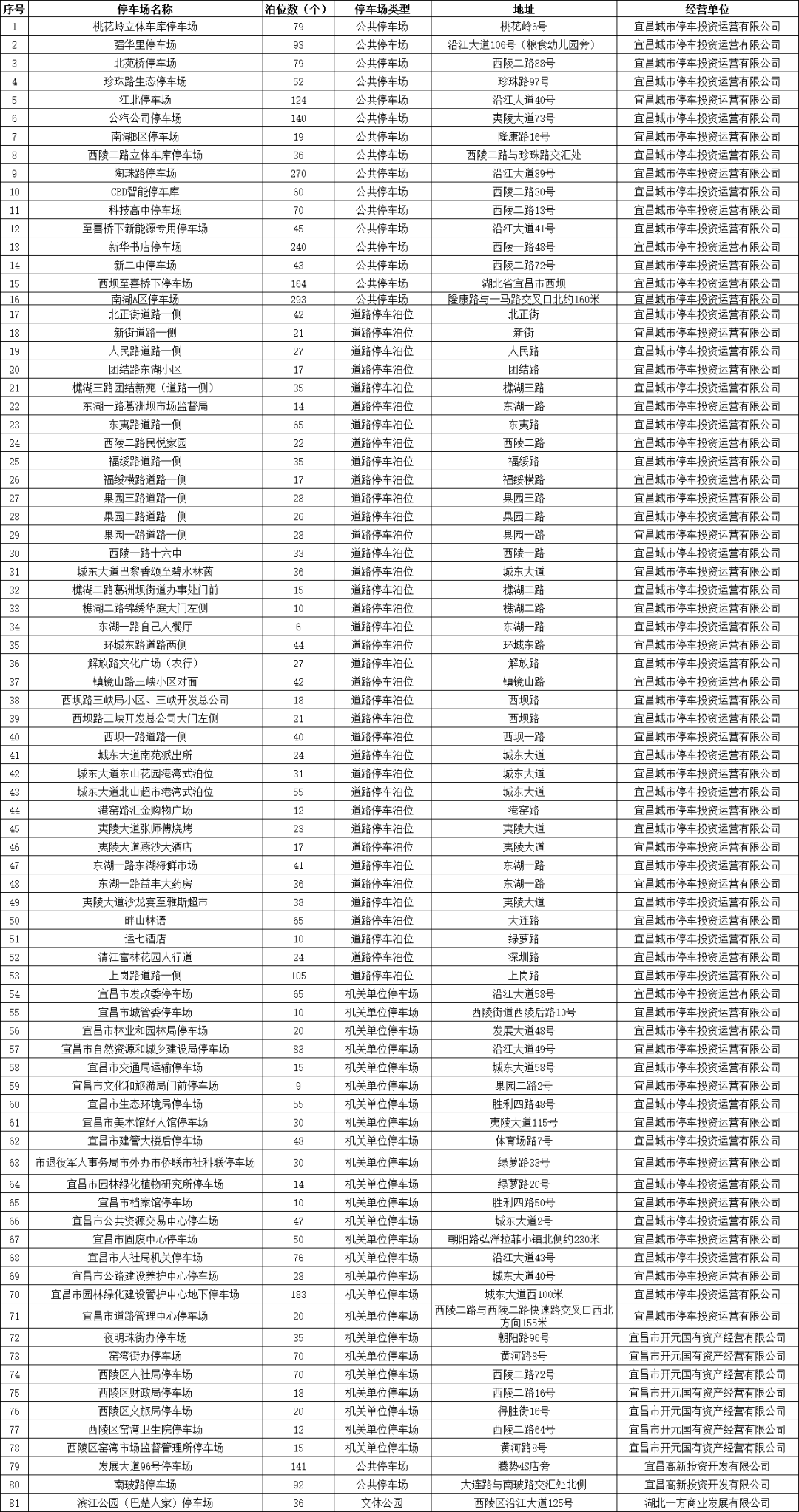 宜昌城发集团自营公共停车场及道路临时停车泊位、部分县市区属国有停车运营企业负责经营管理的公共停车场、具备条件的政府行政事业单位内部停车场共455处停车场(点)、36124个泊位,其中城区有298处停车场(点)、19939个泊位。