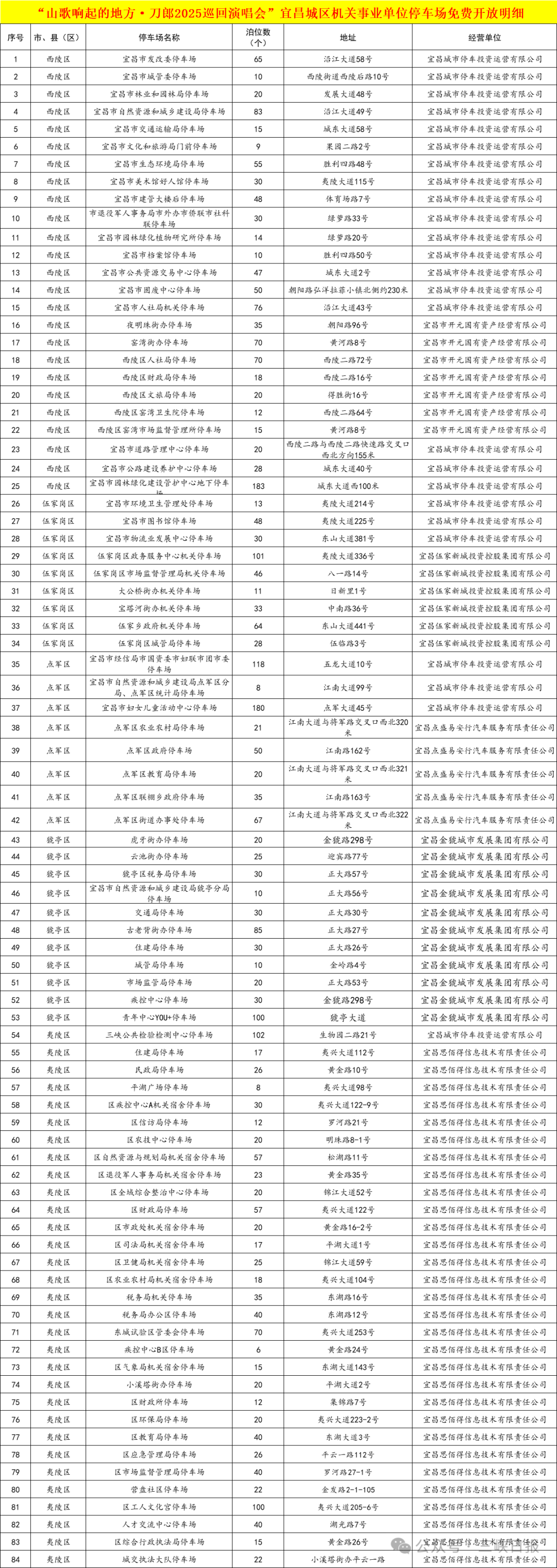 本次免费开放的84个机关事业单位停车场覆盖西陵区、伍家岗区、点军区、猇亭区和夷陵区。演唱会两天,游客和市民可根据个人行程安排,选择合适的停车场停车。