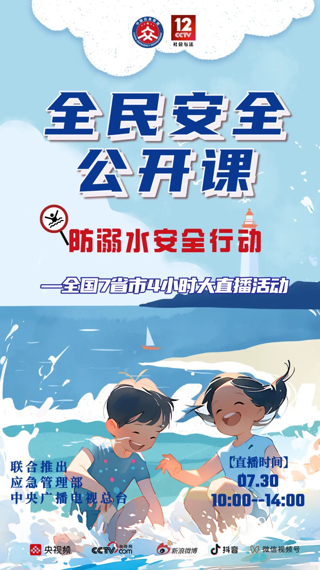 为增强全民安全意识、提高公众自救互救能力,结合“七下八上”防汛关键期和暑期重要时段,应急管理部联合中央广播电视总台于7月30日(星期三)10:00共同推出《全民安全公开课》“防溺水安全行动”网络直播活动。应急管理部“两微”、抖音、快手、视频号,央视频、央视网、央视社教节目中心矩阵号等新媒体平台同步播出。