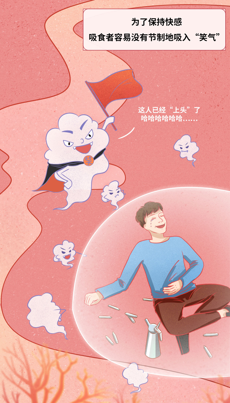 由于快感持续时间很短,吸食者经常会反复吸入,进一步增加了缺氧窒息的风险。大量吸入“笑气”后会产生致幻、谵妄、神志错乱、视听功能障碍和肌肉收缩能力降低等一系列副作用。