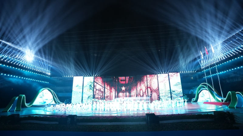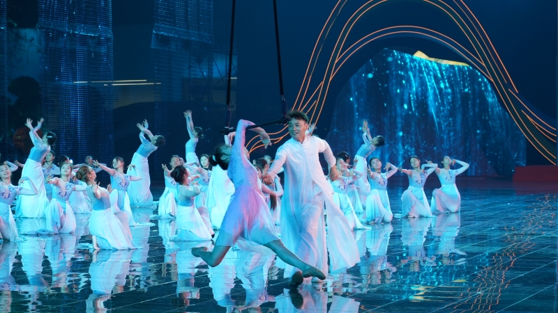 本届七运会开闭幕式总导演李毓川介绍,整场演出以“文明之水、生态之水、活力之水、跨越之水、新时代之水”为主线展开。第一篇章《巴山楚水 千年回响》运用多媒体影像技术再现古宜昌文明脉络;第二篇章《峡江竞秀 击水逐浪》通过动态舞蹈语言展现三峡地域特色;第三篇章《大道通途 华光绽放》则聚焦现代宜昌的发展成就。舞台设计采用多层次立体结构,结合水景特效与灯光装置,营造出山水交融的视觉空间。