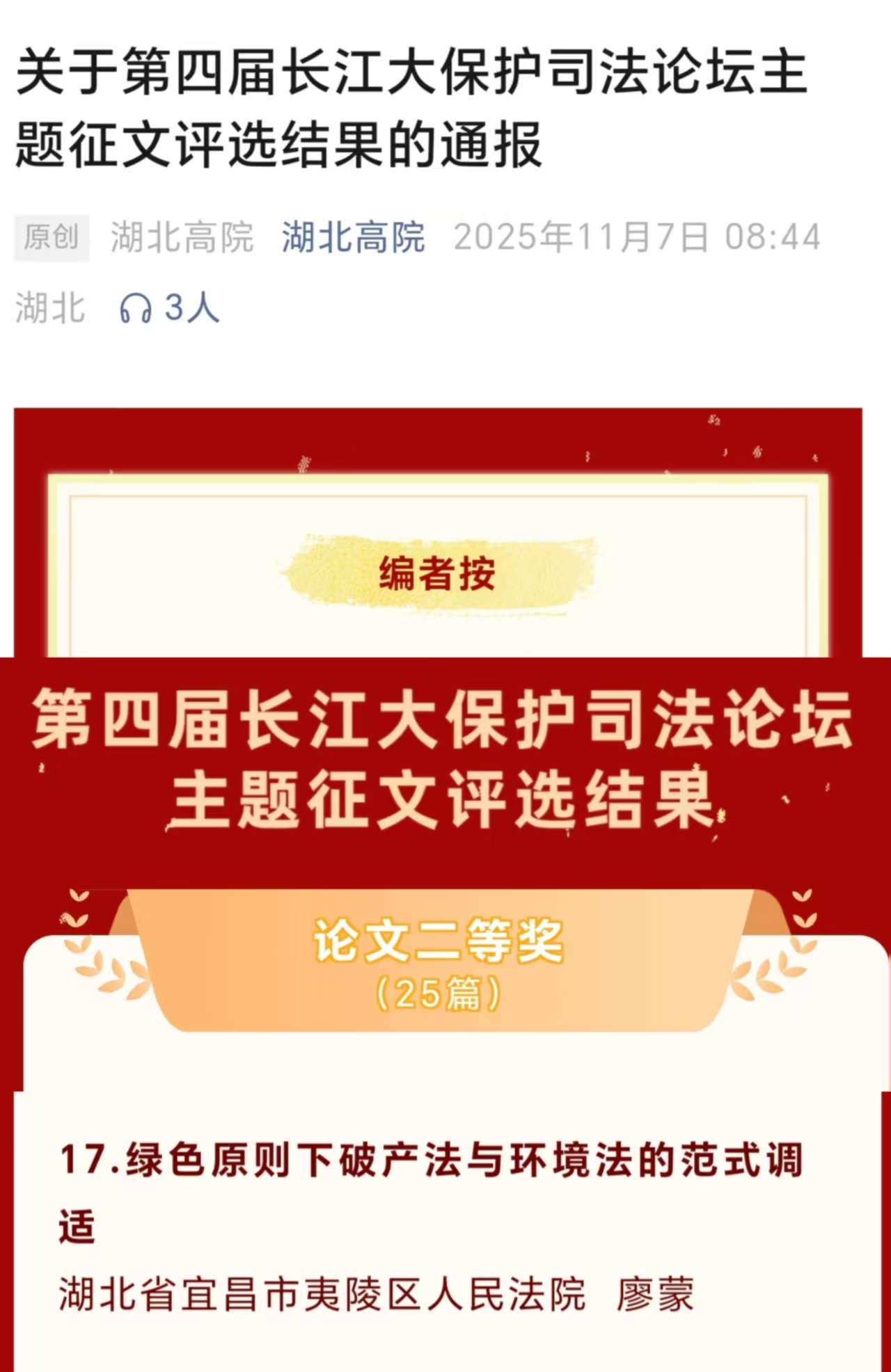 近年来,夷陵法院坚持以实践促研究、以研究强实践,深入探索长江流域生态保护司法路径,先后在第三届、第四届“湖北省长江大保护司法论坛”征文中斩获二等奖等奖项,1篇关于强制腾退、保障水源安全的案例入选“湖北法院强制腾退十大典型案例”,1件非法采矿罪案件获评“全市十佳精品案件”,多篇研究成果为流域生态司法保护提供了有益借鉴。从案件审理中的难点破解,到生态修复机制的创新完善,再到跨部门协同治理的实践探索,夷陵法院始终以理论研究支撑司法实践,为长江流域生态环境保护和高质量发展贡献司法智慧。