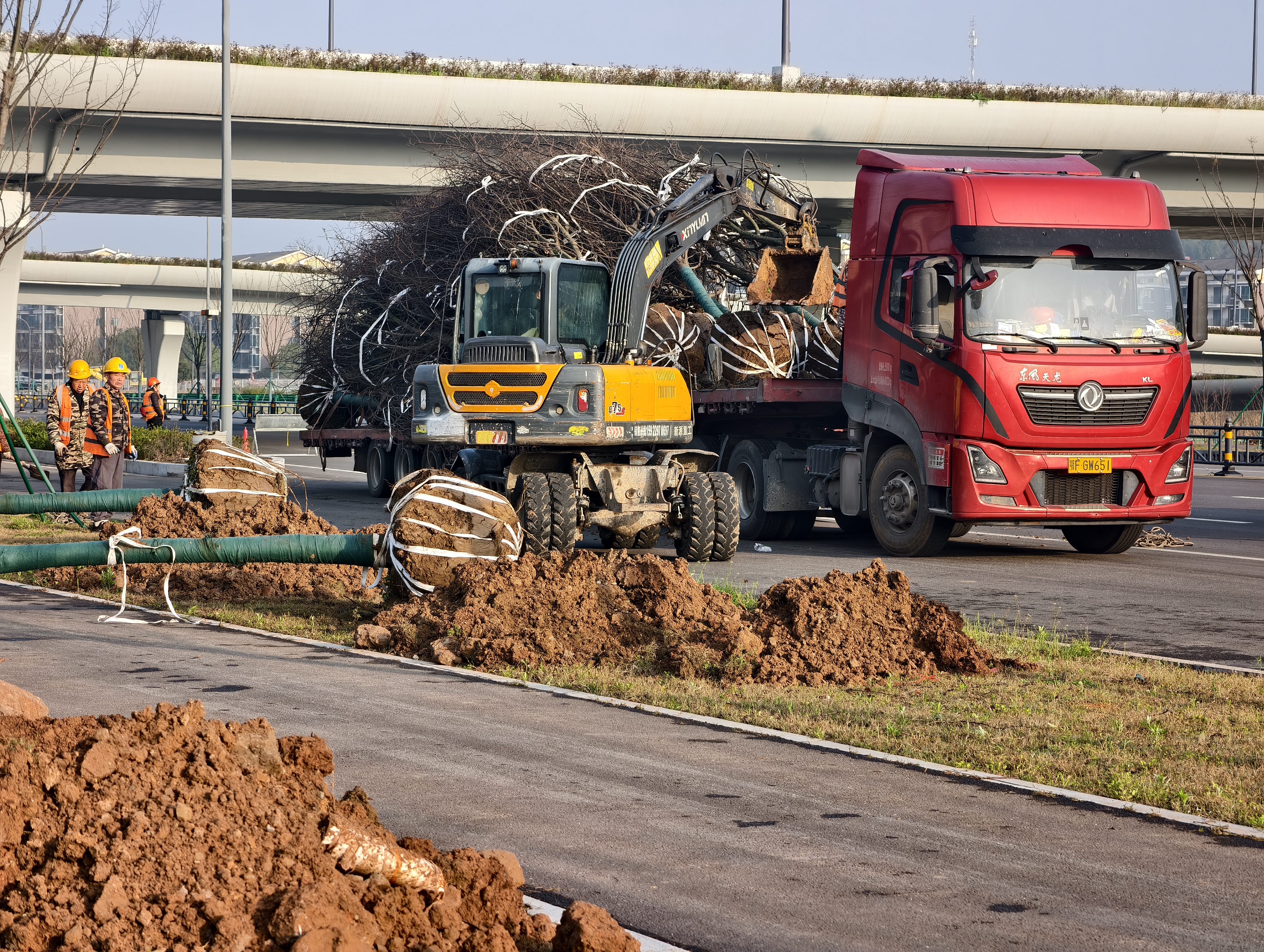 3月22日,夷陵区小鸦路扩建工程沿线一派繁忙景象,公路两侧绿化带内,植树人员抢抓春季植树黄金时节,借助吊车将大卡车运来的绿化苗木精准栽植,有序推进道路绿化施工。
