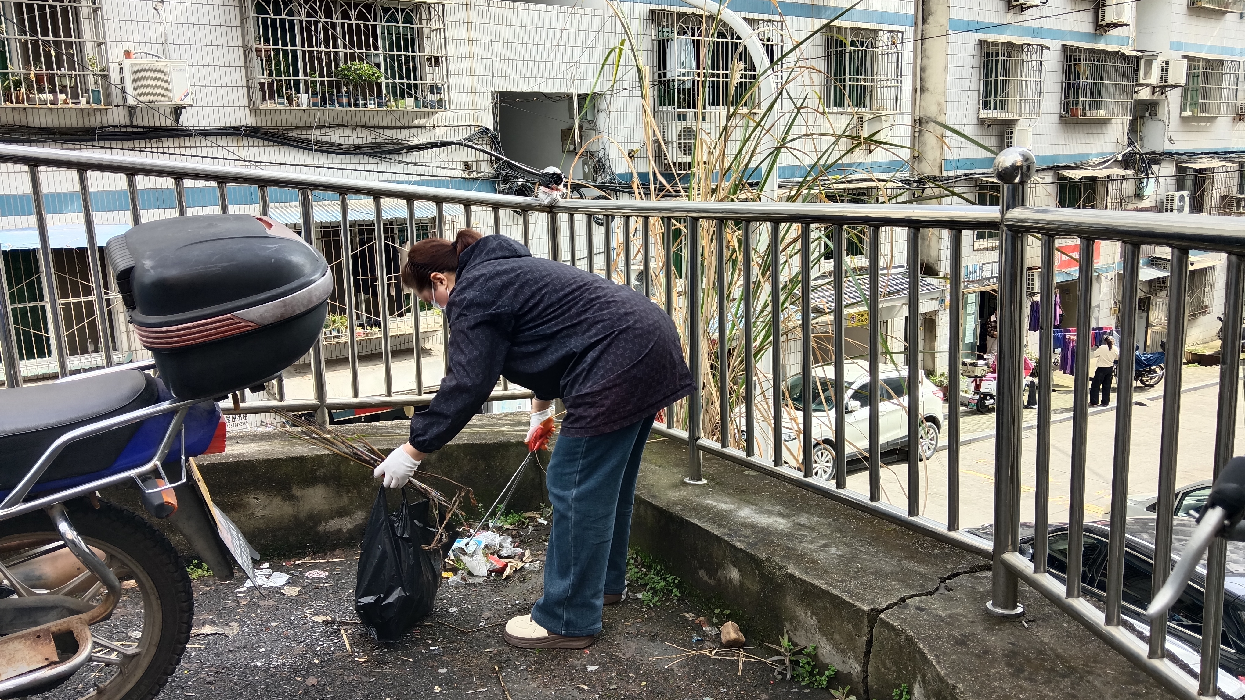 清理过程中,大家分工协作、干劲十足。对卫生死角内的枯枝落叶、塑料袋、建筑垃圾等进行集中清扫,对长期堆积的顽固污渍、墙面小广告进行铲除清理。