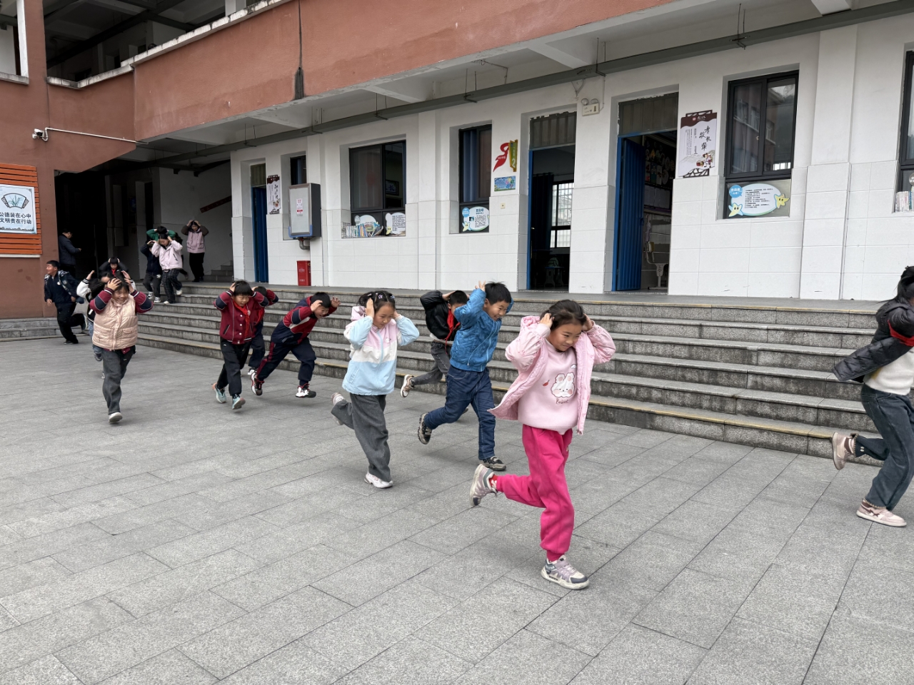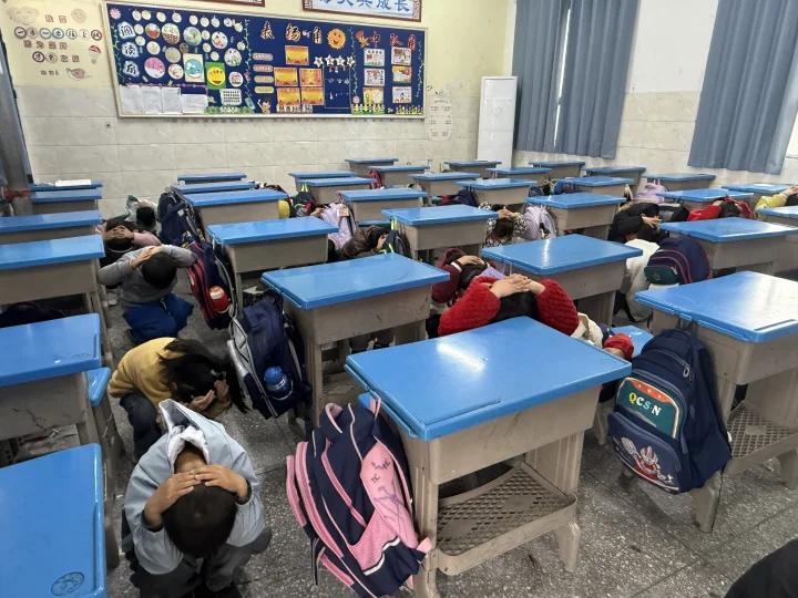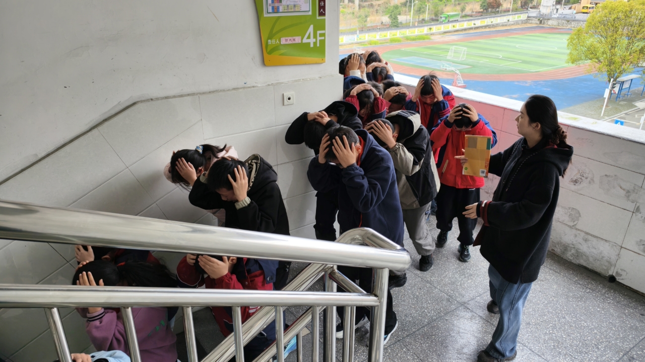随着演练警报声响起,同学们迅速躲至课桌下方,闭眼闭嘴、降低重心、蜷缩身体,规范完成应急避险动作。第二声疏散警报拉响后,全体师生迅速响应、有序撤离。各班教师带队引导,学生分前后门有序出发,按楼层规划路线依次下楼;各楼梯口、关键通道值守教师认真疏导,全程确保队伍不推挤、不落队,整个疏散过程高效顺畅。撤离至安全区域后,学校随即开展了集中安全教育。