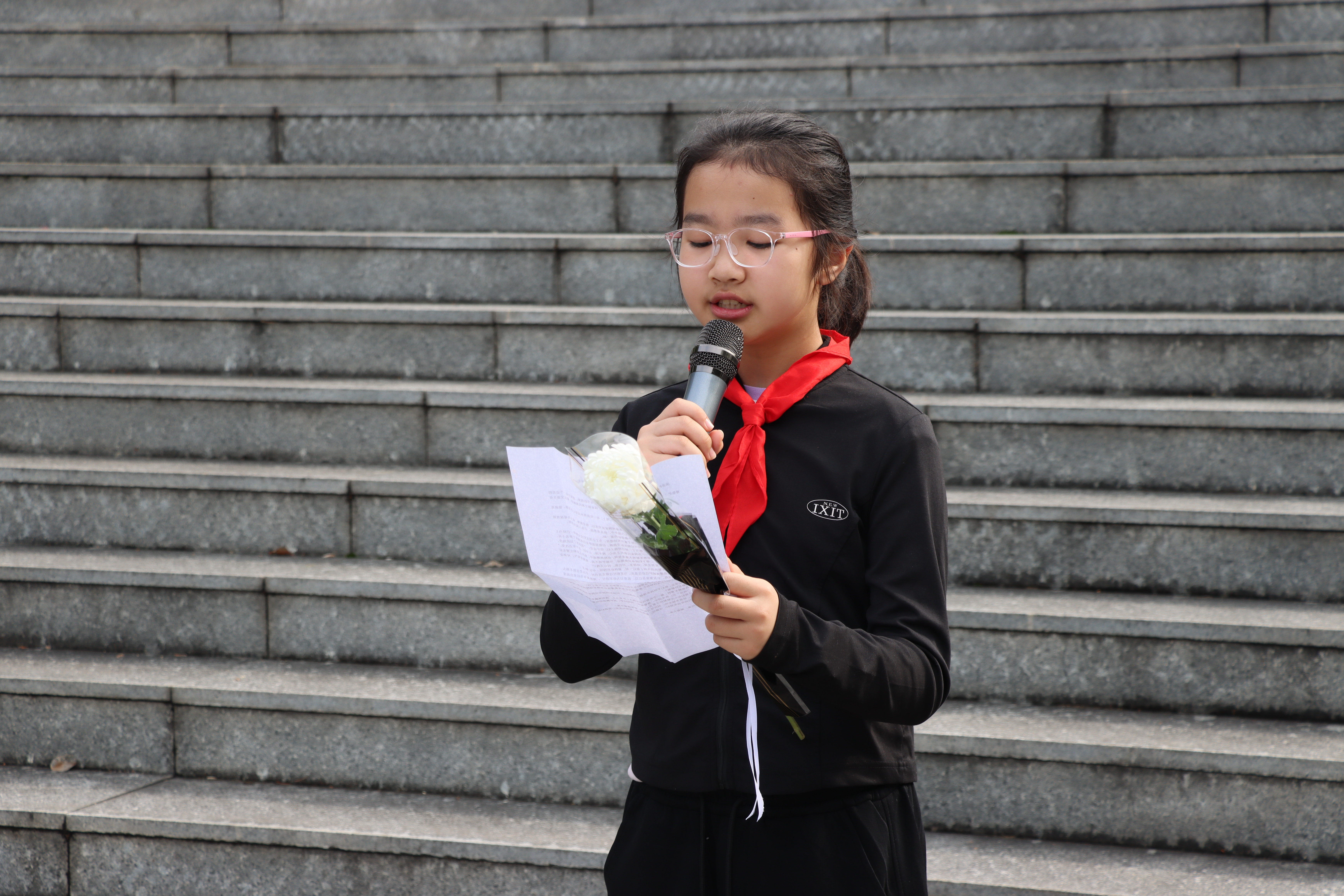学生代表杨欣妍在烈士纪念碑前发表演讲,深情追忆革命先烈的英勇事迹,号召同学们珍惜来之不易的幸福生活,从小学先锋,长大做先锋。全体师生默哀三分钟,并向革命烈士三鞠躬,寄托深切哀思。随后,师生们依次向烈士敬献白菊,朵朵鲜花承载着对英雄的无限敬仰。