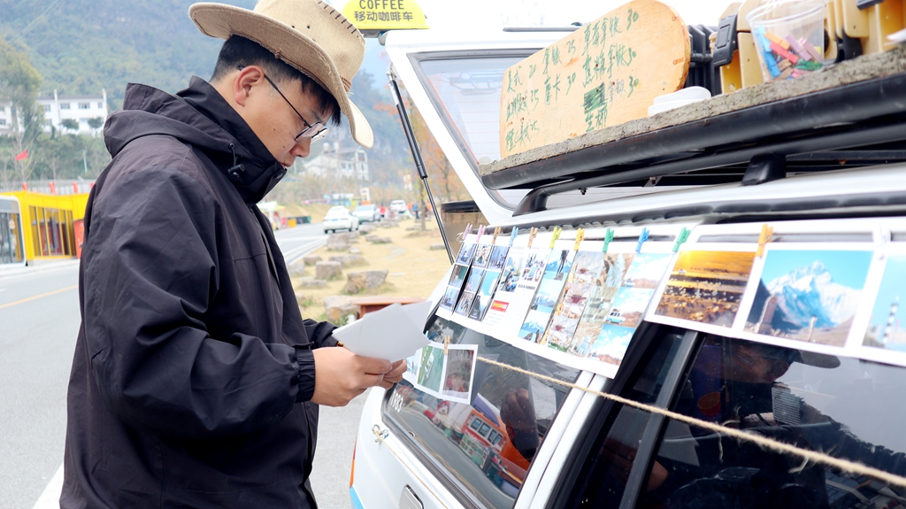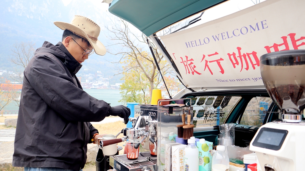 12月的西陵峡,江波荡漾,寒意渐浓。在莲沱畔服务区的路边,一辆后备箱挂着“旅行咖啡”布帘的蓝白复古小车格外惹眼,这是周云精心打造的移动咖啡车,车身挂满了周云游历祖国大好山河的风景照片。