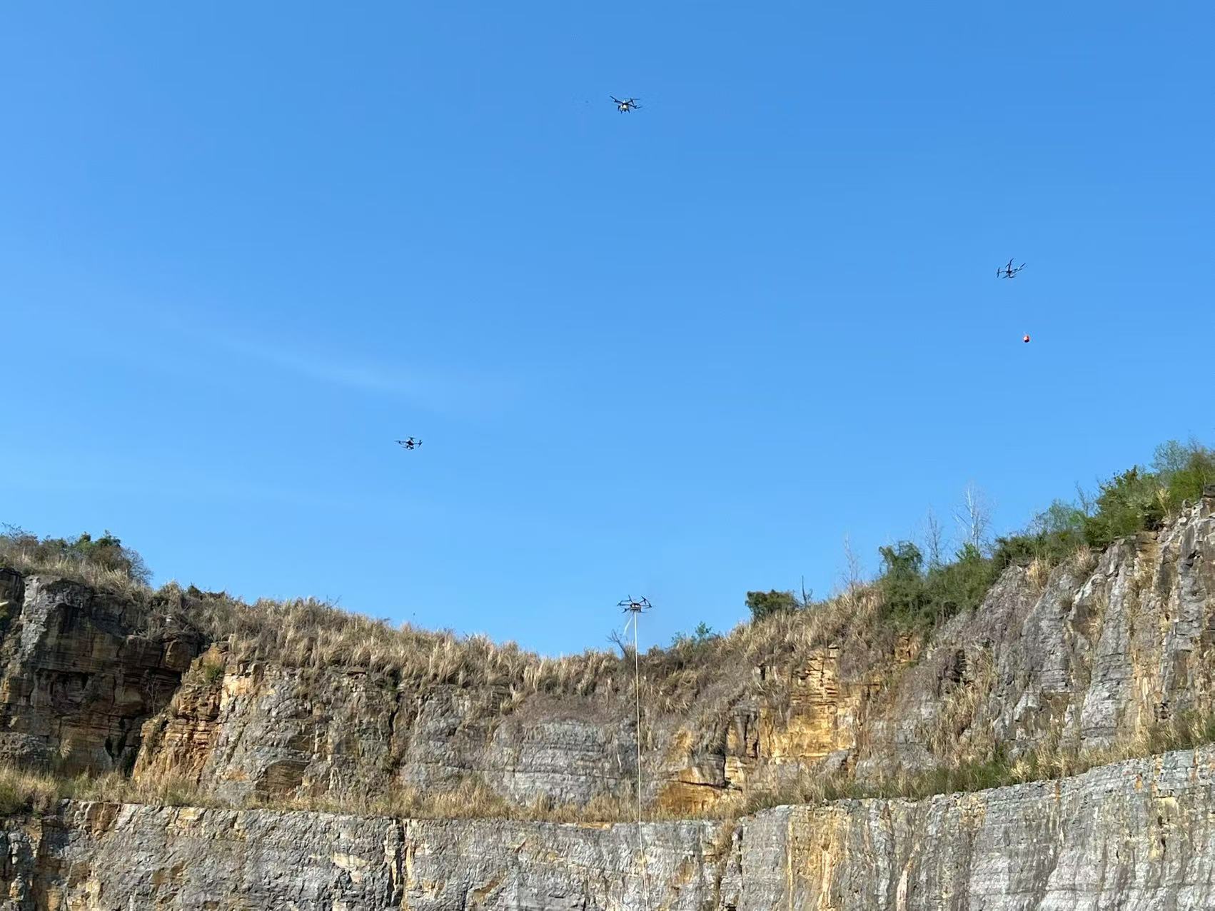 演练紧扣实战需求,设置三大核心科目,多款无人机协同发力。一是无人机吊桶和改装水桶灭火,区矿山救护队、小青蛙科技公司的大疆T100无人机交替起飞,对险要地形明火实施压制;二是无人机携带空爆灭火弹灭火,区消防救援局大疆FC30无人机在火场上空精准引爆,大面积抛撒灭火剂,快速控制火势;三是大载重无人机携带水带灭火,翼安科技X-600型大载重无人机依托高扬程水泵优势,在陡峭高落差山地实现远距离、大水量灭火,提升复杂地形火灾处置效率。