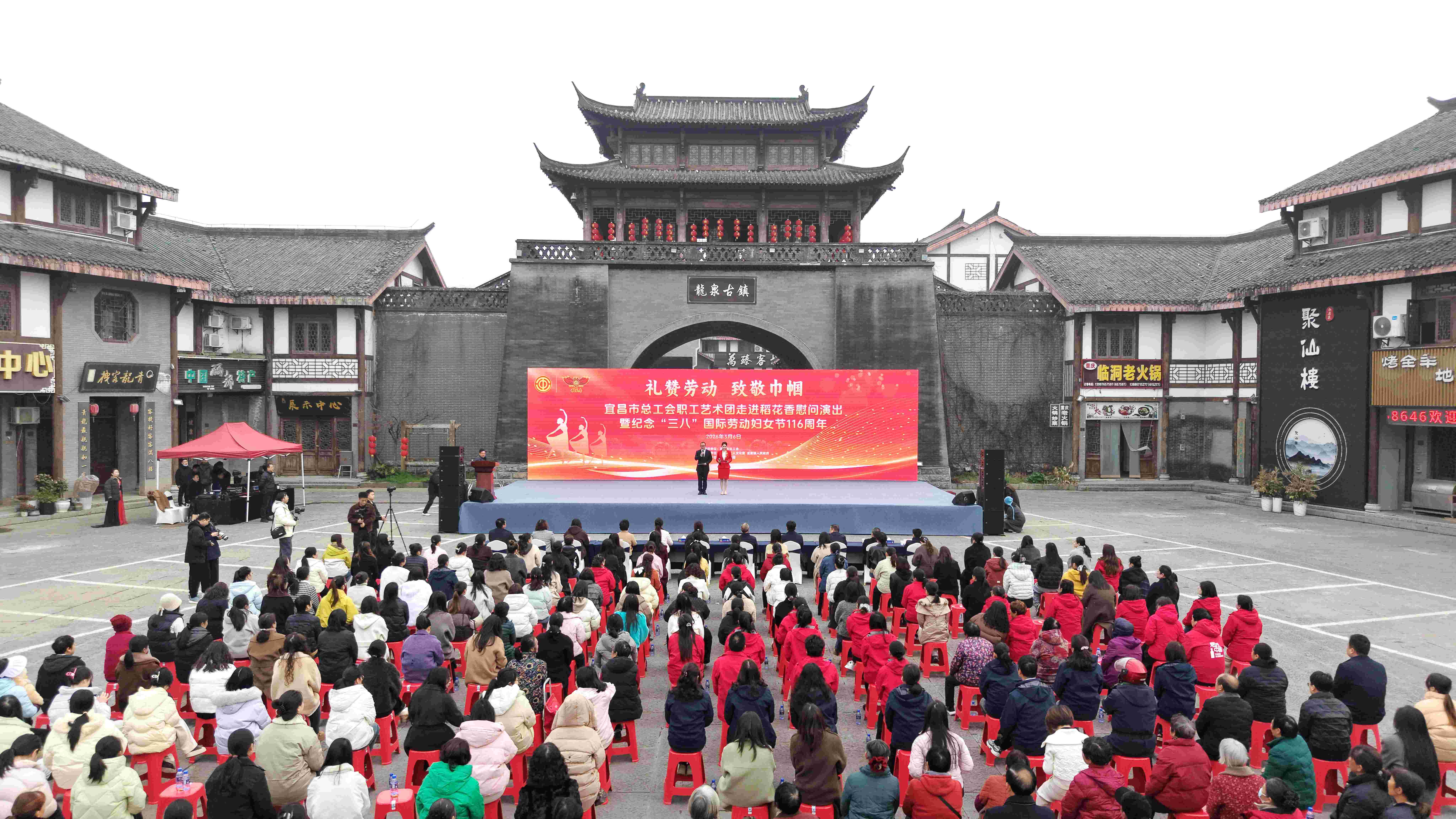 春风送暖,酒城飘香。3月6日上午,“礼赞劳动 致敬巾帼”——宜昌市总工会职工艺术团走进稻花香慰问演出暨纪念“三八”国际劳动妇女节116周年活动在龙泉古镇酒樽广场举行。来自集团各条战线的女职工代表、受表扬的先进集体、家庭代表和先进个人齐聚古镇,共同庆祝属于女性的光辉节日,在欢声笑语中凝聚巾帼力量,共谱奋进新篇。此次活动由宜昌市总工会指导,宜昌市工人文化宫、龙泉镇人民政府主办,稻花香集团承办。