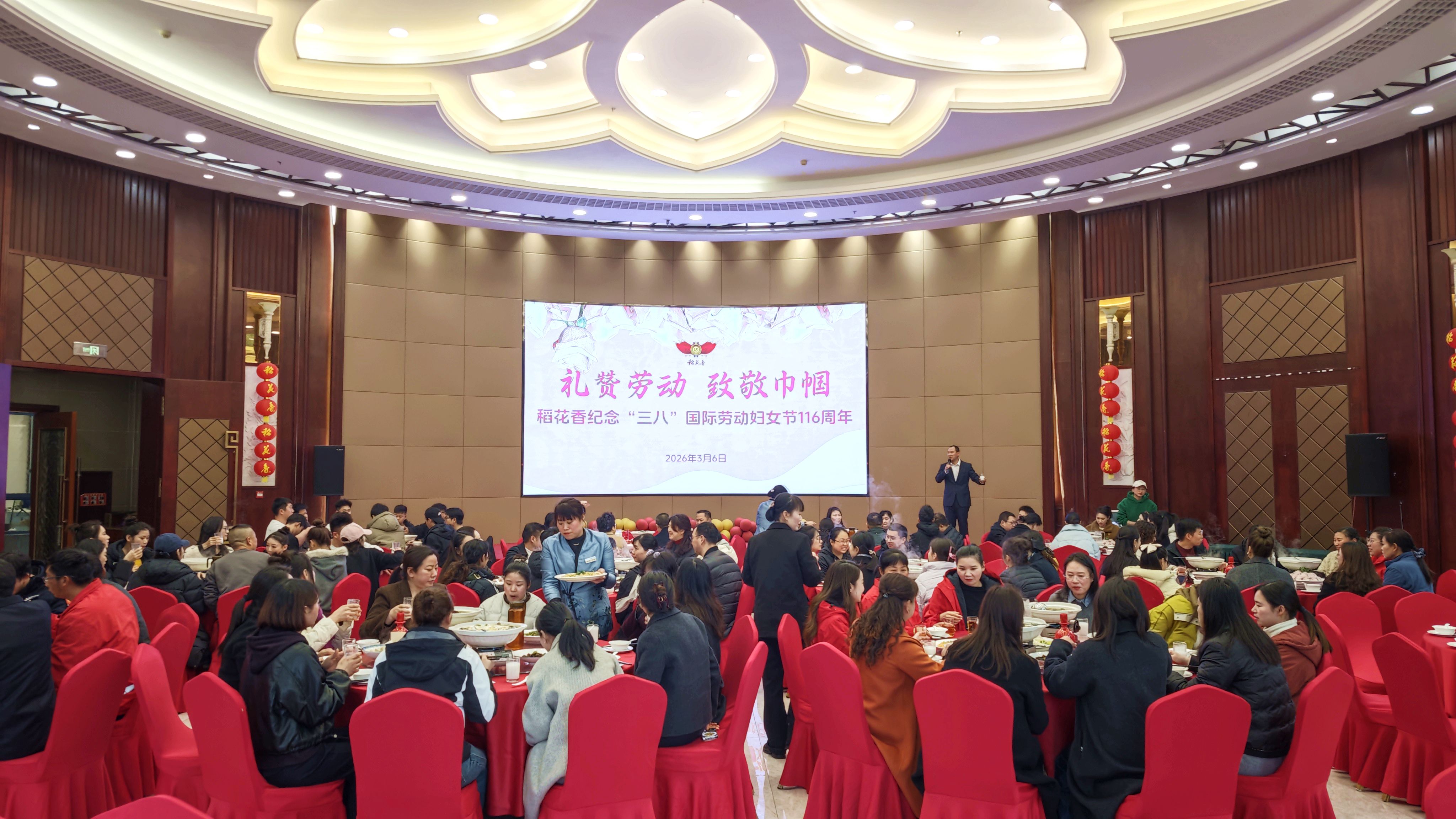 活动结束后,与会人员在稻花香宾馆活力号厅共享节日午宴。大家举杯同庆,畅叙情谊。席间,来自集团管理部的岳龙一曲《精忠报国》慷慨激昂,唱出了稻花香人的豪情壮志与家国情怀;天台包装公司的杨琴则深情演绎《女人花》,柔美的歌声致敬女性的坚韧与芳华,为节日增添了浓浓的温情。