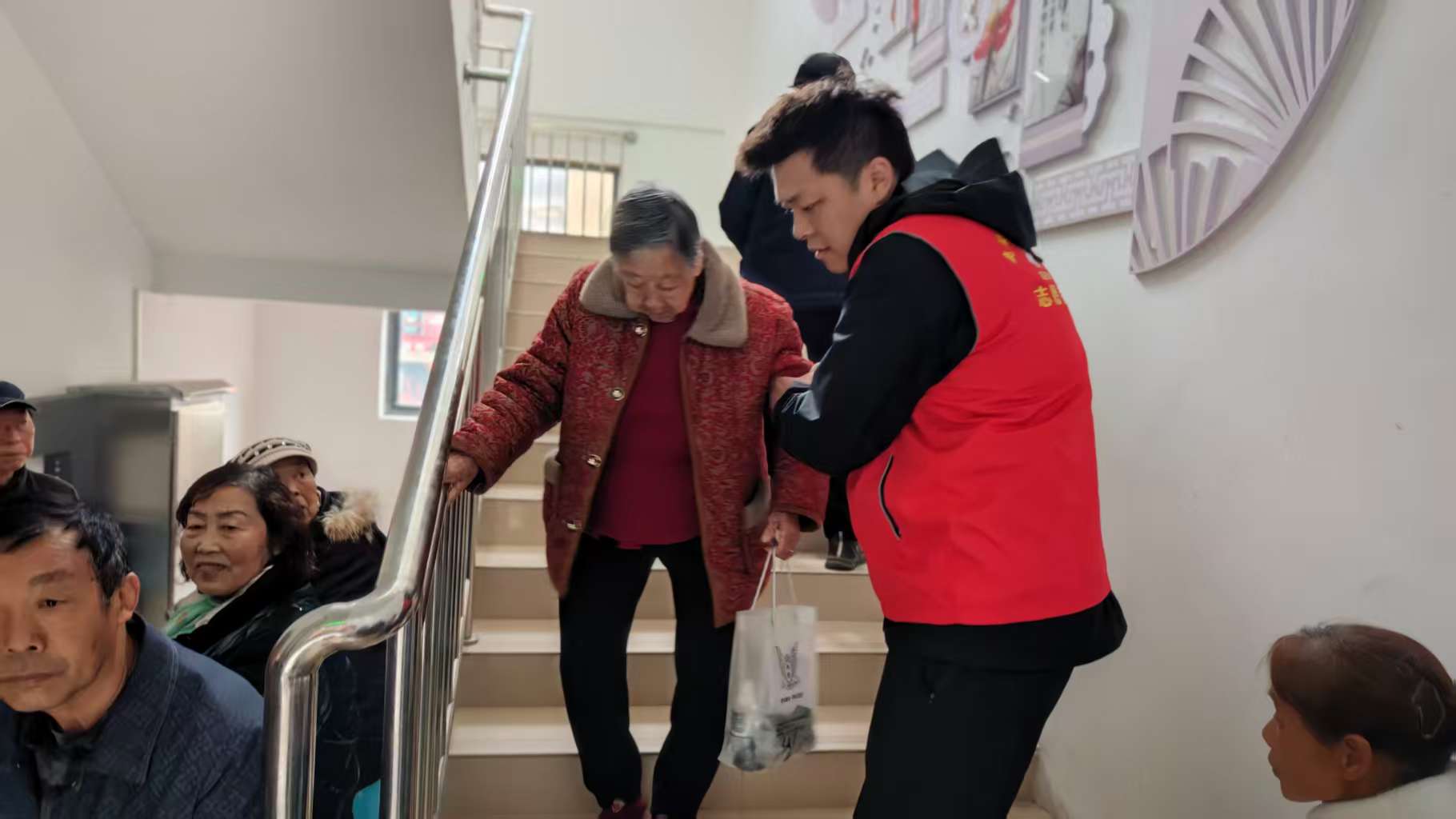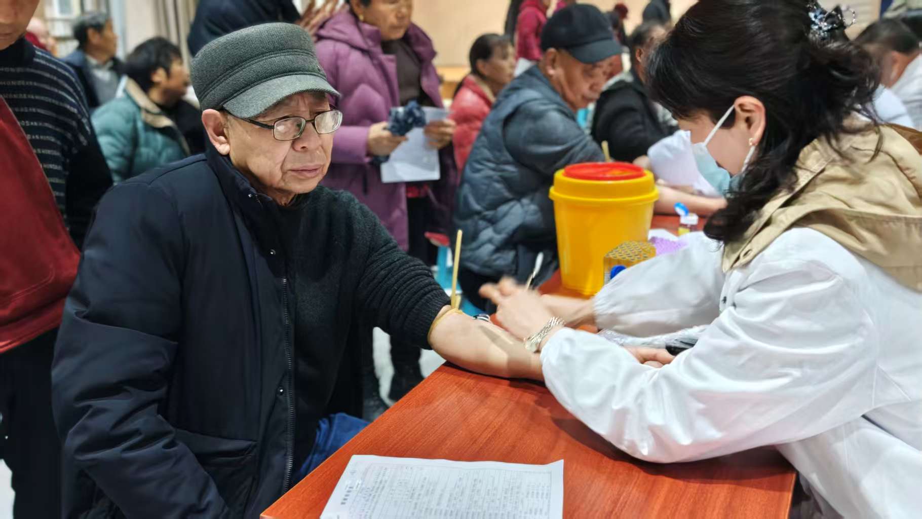 体检现场,在工作人员引导下,老人们分批次完成了血压、血糖、B超、心电图等多个项目检查。现场提供了热水、早餐和休息区,并有志愿者全程协助行动不便的老人,确保服务暖心、高效。