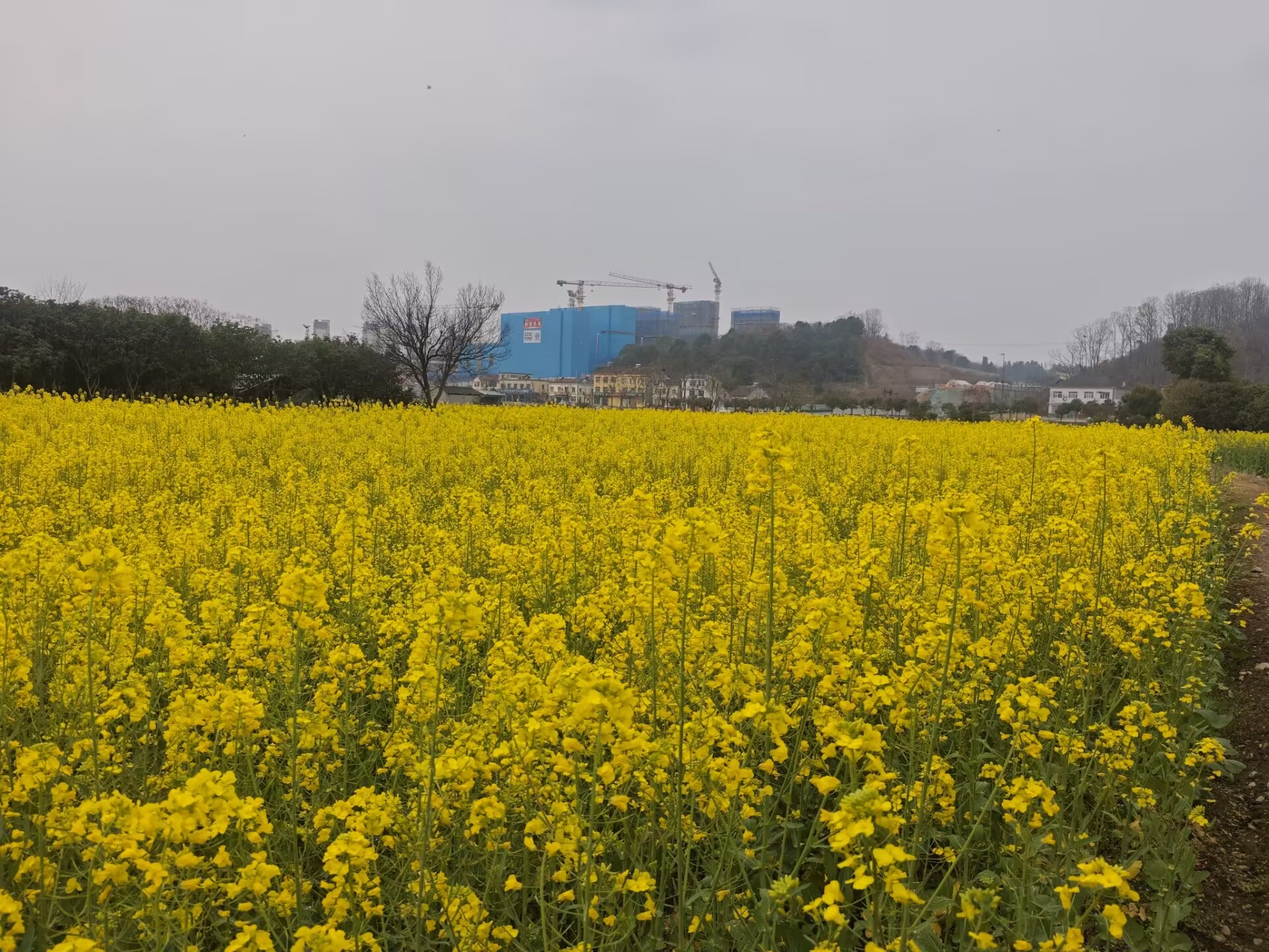 那黄,不是淡淡的浅黄,而是浸了阳光、揉了暖意的浓艳。从山脚的坡地漫开,沿着田埂绕着屋舍,爬过关公坊的厂区,一路铺到龙凤山的半山腰。是谁撞翻了老天的黄漆桶?泼洒得毫无章法,却又像神来之笔,每一抹都恰到好处。田埂是界线,却拦不住这一股烂漫,金黄漫过土埂,把一块块梯田连成一片金色的海。风从柏临河面溜过来,撩动花枝,万千朵菜花频频点头,掀起层层叠叠的金浪,簌簌的声响里,是春天最鲜活的节拍。