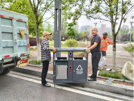 社区当即记录诉求并对接环卫处。工作人员实地勘察点位、协调物资,当天下午便完成5个分类果皮箱的安装落地。现场,工作人员合力将崭新的分类果皮箱安置在步道旁,箱体设有可回收物、其他垃圾投放区及灭烟处,既满足垃圾分类要求,也方便烟民规范处置烟头,从源头减少乱扔现象。