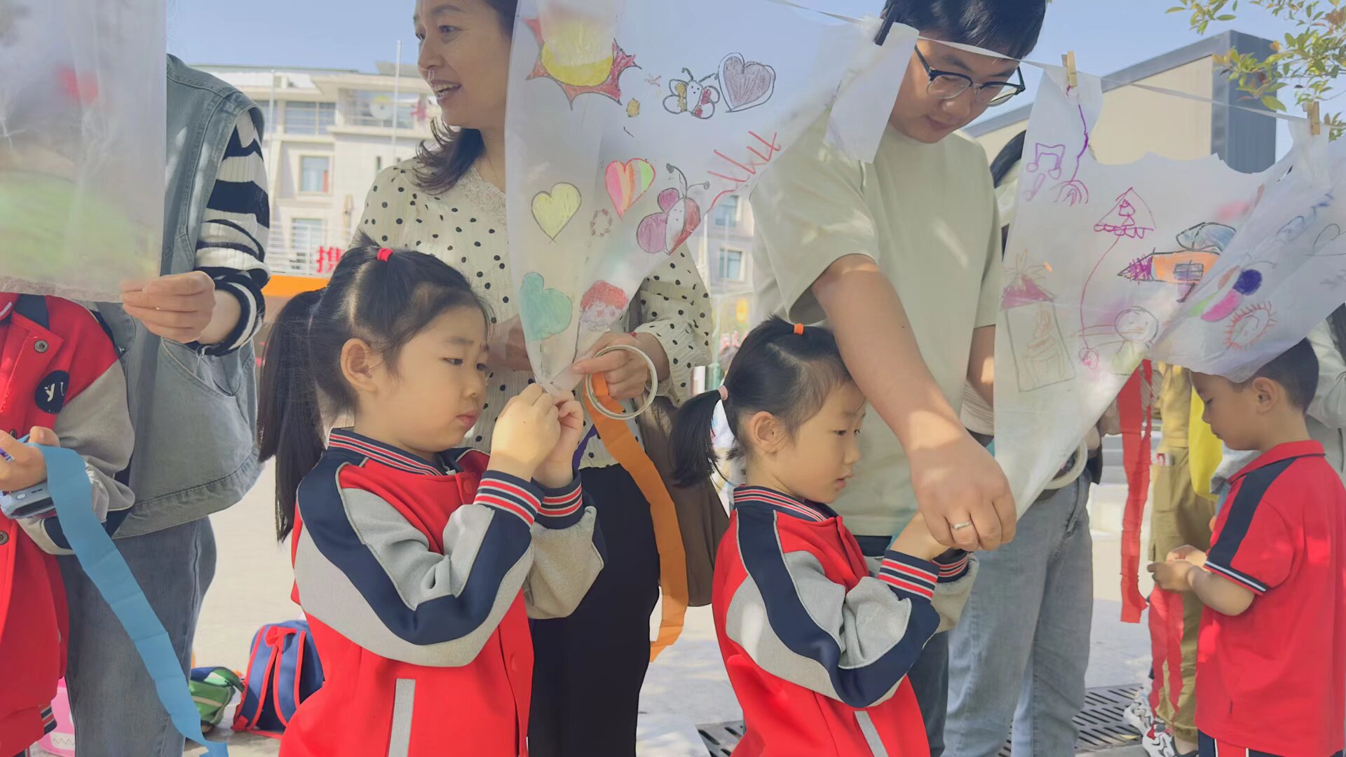 活动当天,现场欢笑声不断。在教师和志愿者的有序引导下,孩子们牵着家长的手,满怀期待地开启这场春日趣味之旅。大家首先动手制作属于自己的“追风袋”——彩笔涂鸦、贴纸装饰、丝带点缀,每一个袋子都充满童真与创意。亲子之间你画我贴、默契配合,在小小的手工中增进了情感交流,浓浓温情在指尖流淌。